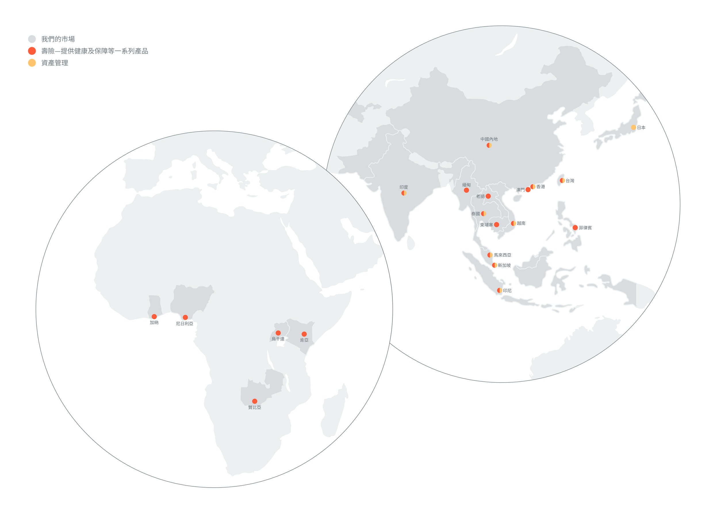 我們規模最大的壽險業務位於中國內地、香港、印尼、馬來西亞及新加坡,並且我們在東南亞及非洲若干其他發展中經濟體亦有開展壽險業務。